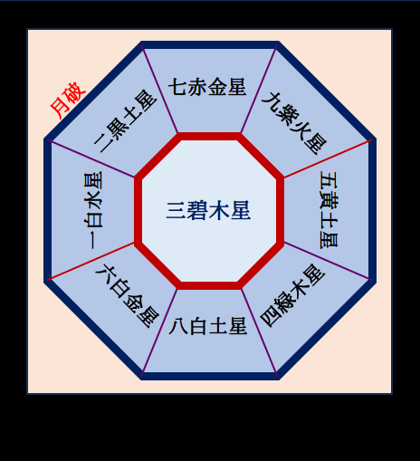 ところが中宮する三碧木星は「木性」、気や風の象意であり、形を持ちません。土と木の対立関係(相剋)から、現実と非現実の葛藤が生まれるのかもしれません。或いは、産みの苦しみのようなことをイメージします。